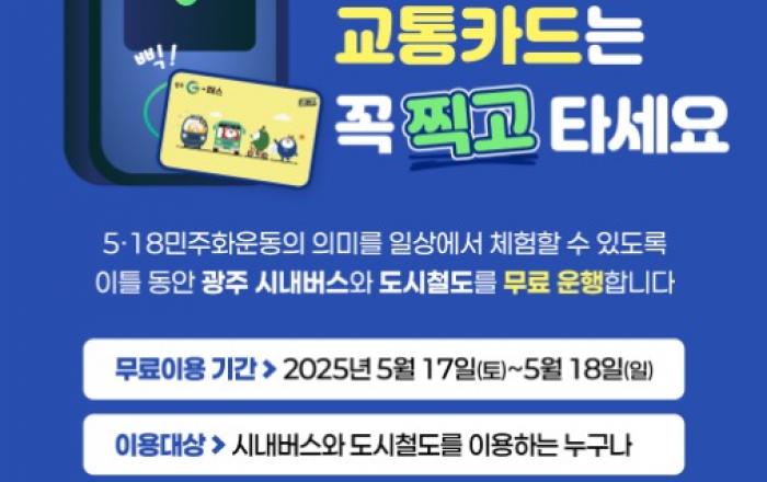 광주광역시(시장 강기정)는 제45주년 5·18민주화운동을 기념해 5월 17일과 18일 이틀간 시내버스와 도시철도 전 노선을 무료로 운행한다.이는 5·18민주화운동의 역사적 의미를 시민과 함께 일상 속에서 되새기고, 기념식과 전야제 등 기념행사에 참여하는 시민과 방문객들