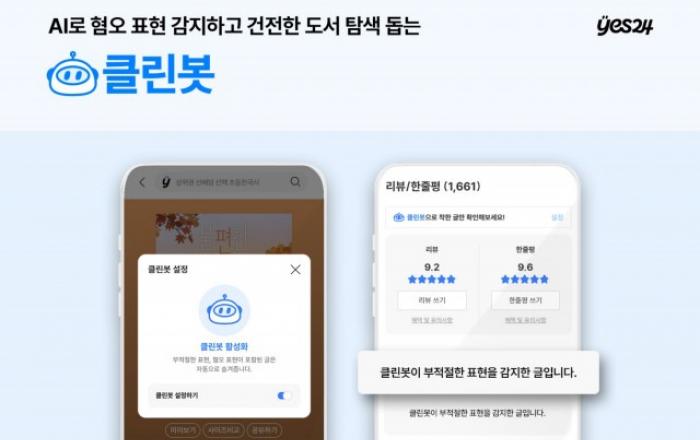 문화콘텐츠 플랫폼 예스24가 AI로 부적절한 혐오 표현을 자동 감지해 필터링하는 ‘클린봇’ 서비스를 도입했다.예스24가 새롭게 도입하는 ‘클린봇’은 도서와 직접적인 관련이 없는 작가·책에 대한 혐오 표현을 AI가 스스로 감지하고 필터링하는 것이 특징이다. 예스24는 해