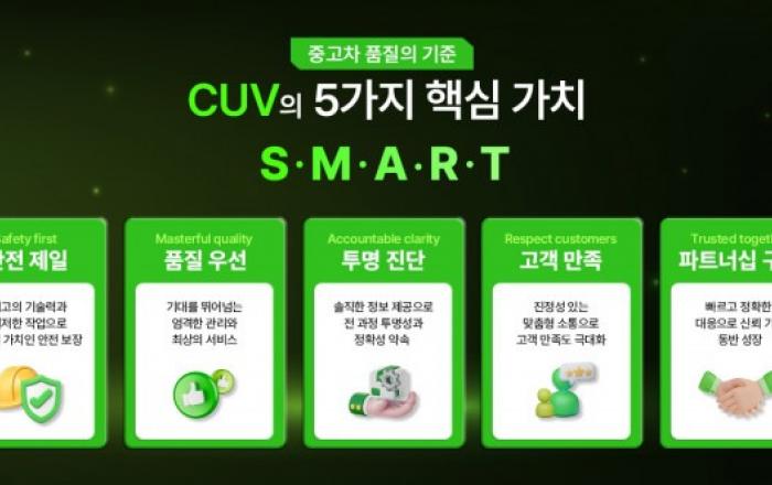 중고차 상품화 및 인증 전문 기관 커브(CUV)가 핵심 가치 ‘SMART’를 공개했다.커브의 핵심 가치 수립은 소비자 신뢰 회복과 중고차 시장 내 투명한 거래 문화 정착을 목표로 진행됐다. 여전히 신뢰 부족 문제를 안고 있는 중고차 산업의 구조적 한계를 개선하기 위해