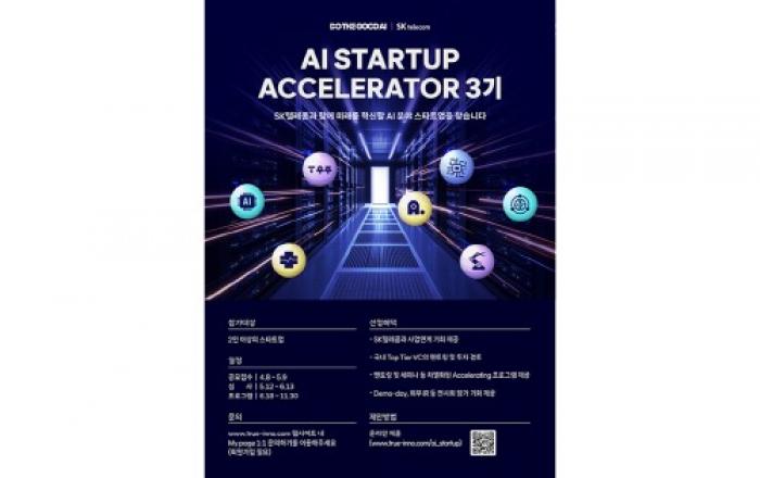 SK텔레콤은 인공지능(AI) 분야 스타트업 발굴과 성장 지원을 위한 전문 프로그램 ‘AI Startup Accelerator(AI 스타트업 엑셀러레이터)’에 참여할 스타트업 공모에 나선다고 9일 밝혔다.SK텔레콤(대표이사 CEO 유영상, www.sktelecom.com