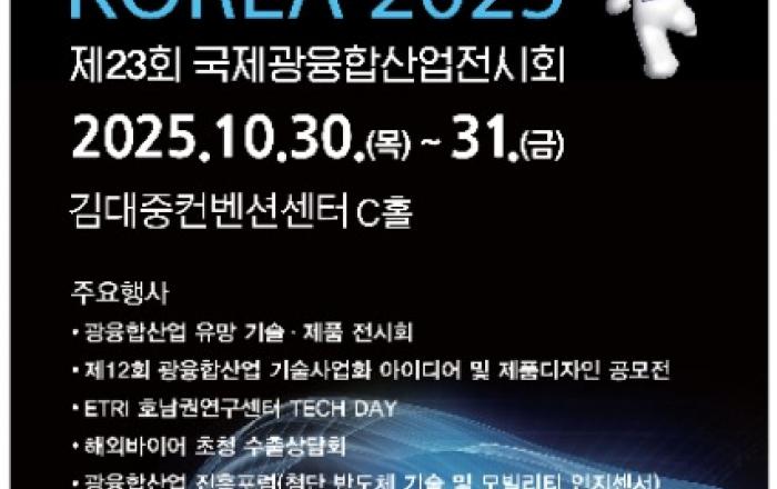국내외 광융합산업의 최신 기술과 시장 동향을 한 자리에서 볼 수 있는 전시회가 광주에서 열린다.광주광역시(시장 강기정)는 오는 30일부터 31일까지 이틀간 김대중컨벤션센터에서 ‘제23회 국제광융합산업전시회(포토닉스코리아 2025)’를 개최한다. 이 행사는 광주시와 산업