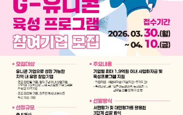 광주광역시는 지역 내 혁신기술을 보유한 창업기업을 발굴해 세계적 경쟁력을 갖춘 유니콘 기업으로 키우기 위한 ‘지(G)-유니콘 육성 프로그램’ 참가 기업을 오는 4월10일까지 모집한다.‘지(G)-유니콘 육성 프로그램’은 독보적인 기술과 사업모델을 보유한 창업기업의 규모