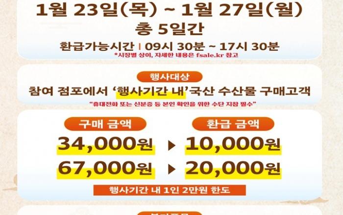 해양수산부는 설 명절 소비자 물가부담 완화를 위해 오는 23일부터 27일까지 전국 158개 전통시장에서 '설맞이 전통시장 온누리상품권 환급행사'를 개최한다고 밝혔다.이번 행사는 전통시장에서 국산 수산물을 구매한 소비자들에게 구매금액의 최대 30%를 1인당 2만 원 한도