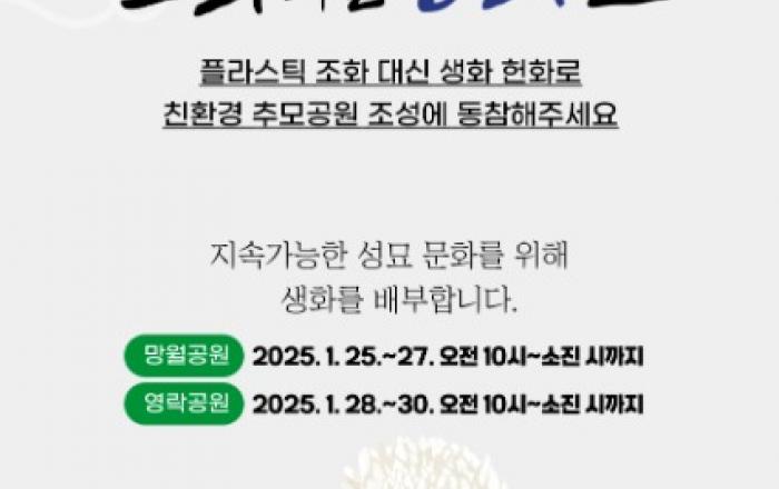 설 명절 기간 망월묘지공원과 영락공원에 플라스틱 조화 반입이 제한된다.광주광역시(시장 강기정)와 광주도시공사는 설 명절 기간 망월묘지공원과 영락공원에서 생화를 배부하며 ‘플라스틱조화 없는 친환경 추모공원 캠페인’을 추진한다.망월묘지공원은 25일부터 27일, 영락공원은