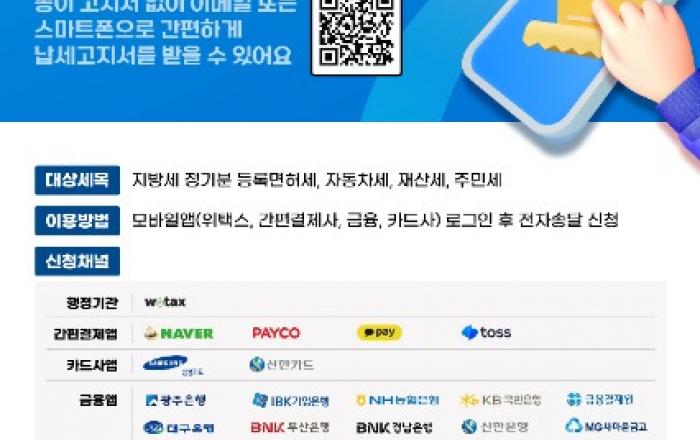 광주시 “지방세 전자송달 신청하면 할인”광주광역시(시장 강기정)는 납세자의 편의 증대와 탄소중립 실천을 위해 지방세 고지서 전자송달 신청을 받는다.지방세 전자송달은 납세자가 종이고지서 대신 전자우편이나 모바일앱을 통해 간편하게 고지서를 확인하고 납부할 수 있는 서비스다