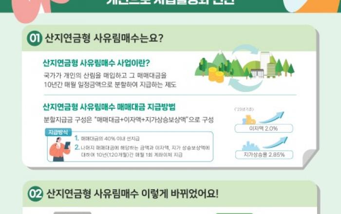 산림청은 개인이 소유한 산을 판매해 10년 동안 연금형으로 지급받는 ‘산지연금형 사유림 매수사업’이 올해 매수 목표량 742ha을 달성하며 산주들로부터 큰 호응을 얻고 있다고 22일 밝혔다.‘사유림 매수사업’은 산주들이 소유한 산을 산림청에 팔면 매매대금을 10년간 매