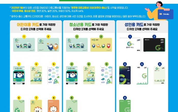 광주시가 광주형 대중교통비 지원 정책인 ‘광주G-패스’를 상징하는 교통카드 디자인을 시민 참여로 결정한다. 광주광역시(시장 강기정)는 광주G-패스 카드 디자인에 대한 시민의 의견을 수렴하기 위해 18일부터 22일까지 광주온(ON) 설문과 오프라인 투표를 함께 실시한다.
