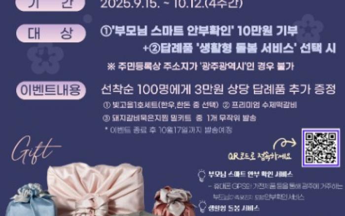 광주시가 추석명절을 맞아 고향사랑기부로 ‘부모님 스마트 안부확인 서비스’를 신청한 기부자 100명에게 3만원 상당의 프리미엄 답례품을 추가로 제공한다.광주광역시(시장 강기정)는 오는 10월12일까지 고향사랑기부제 참여를 독려하고 부모님 돌봄서비스 이용을 장려하기 위해