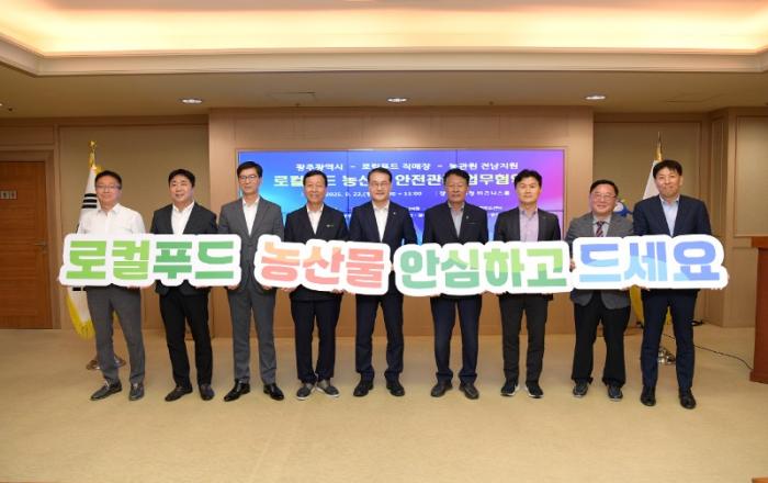 광주광역시(시장 강기정)는 22일 시청 비즈니스룸에서 지역 12개 로컬푸드 직매장과 국립농산물품질관리원 전남지원이 함께 하는 ‘로컬푸드 농산물 안전관리를 위한 업무협약’을 체결했다.이번 협약식에는 최삼규 평동농협 조합장, 김재필 광주축산농협 조합장, 김태오 농협하나로유