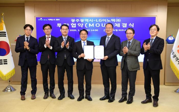 광주광역시(시장 강기정)와 LG이노텍은 13일 시청 비즈니스룸에서 ‘차량용 제어모듈 신규 생산라인 구축을 위한 투자협약’을 체결했다. 이번 협약은 2026년 새해 부강한 광주로의 힘찬 도약을 알리는 첫 신호탄이다.이날 협약식에는 강기정 시장과 김영문 문화경제부시장, 손