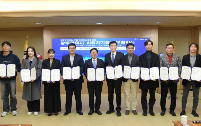 광주시가 인공지능(AI) 전문기업과 협력을 통해 인공지능 기술의 산업 현장 적용을 확대하고, 실증 중심의 인공지능(AI) 산업 생태계 확장에 나선다.광주광역시(시장 강기정)는 16일 시청 비즈니스룸에서 제조·헬스케어 등 인공지능(AI) 전문기업 9개사와 ‘광주형 인공지
