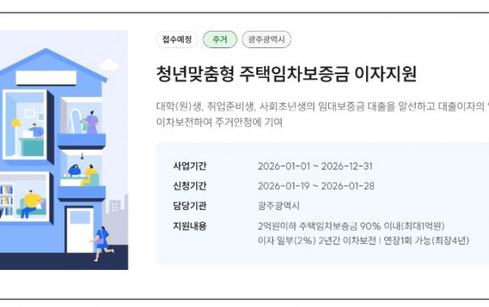 광주광역시(시장 강기정)는 무주택 청년의 주거비 부담 완화를 위한 청년맞춤형 주택임차보증금 이자지원 사업 대상자를 19일부터 모집한다.이 사업은 청년이 전·월세 임차보증금을 대출할 때 발생하는 이자를 일부 지원하는 사업이다. 광주시가 대상자를 선정하면 광주은행이 대출을