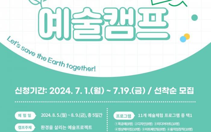 광주학생예술누리터가 지역연계 예술체험 프로그램 ‘방학예술캠프 Let’s save the Earth together’에 참여할 학생을 모집한다.방학예술캠프는 오는 8월 5일부터 9일까지 ‘환경을 살리는 예술프로젝트’를 주제로 진행되며, 대상은 초등학교 4학년~중학교 3학