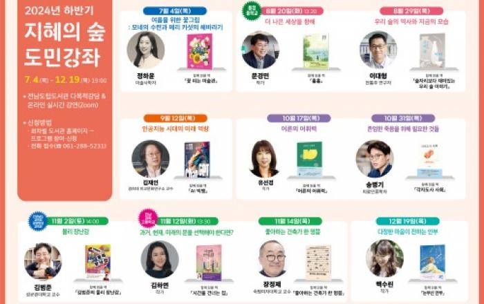 전남도립도서관이 도민의 인문 소양을 높이고, 독서문화 확산을 위해 4일부터 ‘하반기 지혜의 숲 도민강좌’를 본격 운영한다.‘지혜의 숲 도민강좌’는 2013년 시작해 지금까지 229차례 운영, 3만 7천 여 도민이 참여한 전남도립도서관의 대표 인문학 프로그램이다. 20