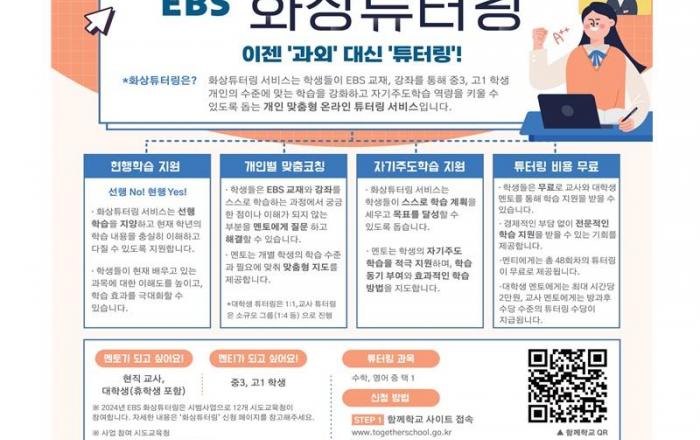 학생이 사교육 없이 교사나 대학생 멘토에게 질문하고 함께 토론하며 자기주도학습 역량을 키우는 무료 화상 튜터링 서비스가 시작된다.교육부는 사교육비 경감 및 교육격차 해소를 위해 현직 교사와 대학생이 참여하는 ‘한국교육방송공사(EBS) 화상 튜터링’ 서비스를 다음 달 1