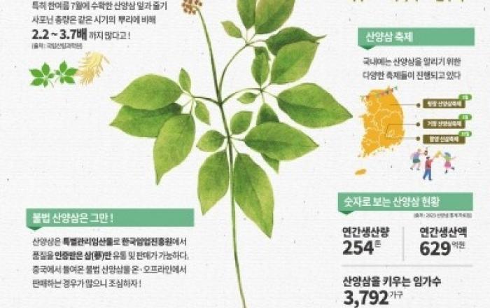 산림청은 6월 이달의 임산물로 자연 그대로의 건강함을 머금은 ‘산양삼’을 선정했다고 28일 밝혔다.산양삼은 산지에서 인공시설을 설치하지 않고 생산된 인삼 속 식물을 뜻하며 특별관리임산물로 지정돼 있어 한국임업진흥원의 품질검사에 합격해야만 ‘산양삼’으로 부를 수 있다.