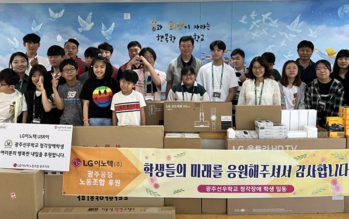 광주선우학교는 지난 21일 청각장애 학생들을 위한 ‘LG이노텍 광주공장 노조, 물품 기탁식’을 개최했다고 밝혔다.이날 LG이노텍 광주공장 노조는 대학에 진학하는 광주선우학교 재학생에게 900여 만원 상당의 교육활동 물품을 전달하고 격려했다.청각학급 고등학교 3학년 유경
