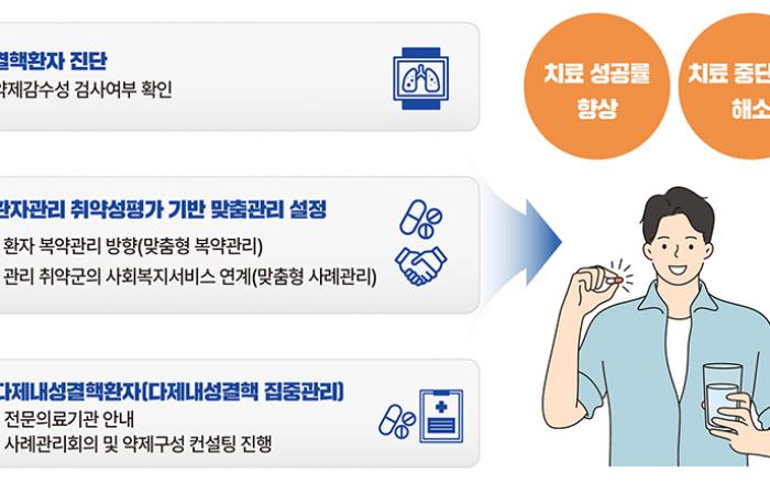 질병관리청은 오는 6월 1일부터 결핵환자의 치료성공률 향상을 위해 환자의 상황에 따라 진단, 복약관리, 사회복지서비스 연계, 전문치료지원을 하는 ‘결핵환자 맞춤형 통합관리’를 시행한다고 밝혔다. 이에 지자체·의료기관과 협력해 고위험 다제내성결핵환자를 집중관리하는데, 특