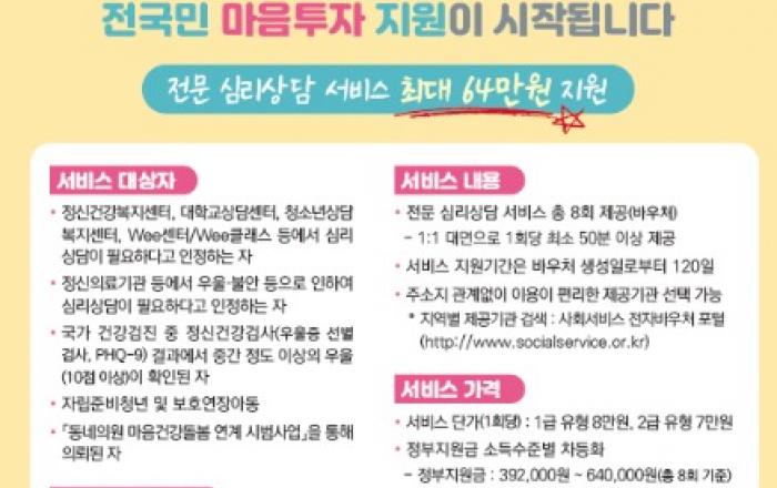 광주광역시(시장 강기정)는 7월 1일부터 ‘전국민 마음투자 지원사업’을 추진한다.올해 첫 시행하는 ‘전국민 마음투자 지원사업’은 우울·불안 등 정서적 어려움이 있는 시민에게 심리상담 서비스를 제공, 시민의 마음건강을 돌보는 사업이다.지원대상은 정신건강복지센터, 대학교