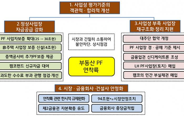 정부가 부동산 프로젝트파이낸싱(PF) 사업성 평가를 강화해 사업장 옥석 가리기에 나선다. 이를 위해 PF 대주단협약 개정 및 경·공매 기준을 도입하고 합리적이고 객관적인 PF 사업성 평가 기준을 마련해 금융회사 스스로 엄정하게 사업성을 판별하도록 유도한다. 또, 사업성