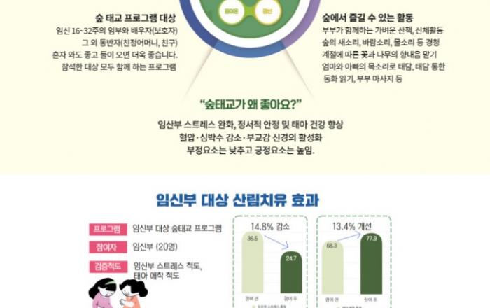 산림청은 국·공립 치유의 숲에서 운영하는 ‘산림치유 프로그램’이 임신부의 태교와 난임우울증 개선에 도움이 된다고 20일 밝혔다. 생애주기별 산림복지 서비스 중 출생기에 해당되는 ‘숲태교’는 산림청과 서울대학교 간호대학이 공동연구해 만든 산