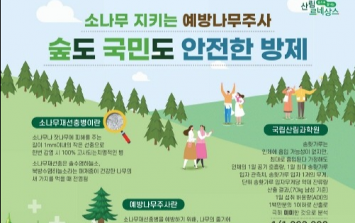 산림청은 소나무재선충병 예방에 사용되는 나무주사는 농약관리법에 따라 농촌진흥청에서 안전성이 검증된 약제라고 25일 밝혔다. 소나무재선충병 방제 약제는 약효와 독성 등을 시험해 안전하다고 인정된 농약에 해당하며 사과, 오이 등 여러 농작물