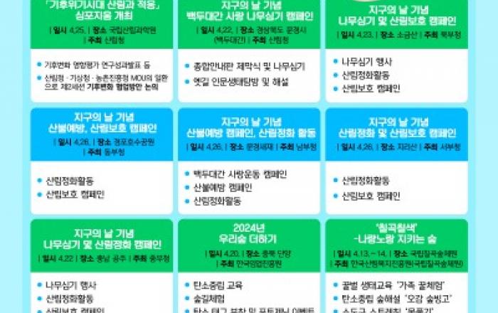 산림청은 오는 22일 ‘지구의 날’을 맞아 ‘산림이 살아야 지구가 산다’를 주제로 산림정화 활동, 백두대간 사랑 나무심기, 심포지엄 등 민간, 학계, 정부가 참여하는 탄소중립 실천 행사를 전국적으로 개최한다고 21일 밝혔다. 먼저, ‘지구
