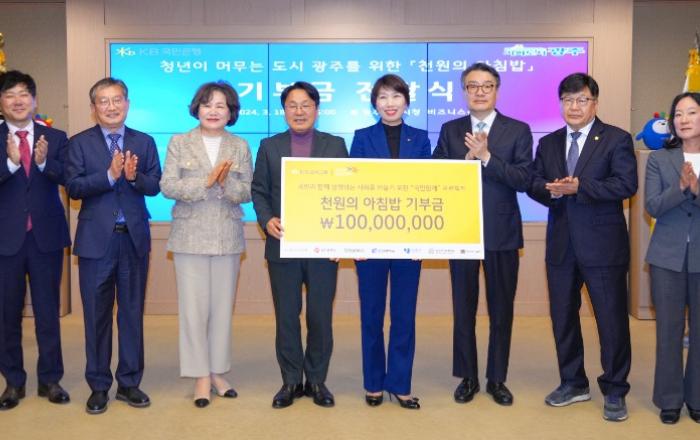 KB금융그룹이 광주지역 대학생들의 아침밥을 지원하는 ‘천원의 아침밥’ 사업에 함께한다.광주광역시(시장 강기정)는 18일 시청 비즈니스룸에서 강기정 시장, 노현주 KB국민은행 호남지역그룹대표, 김병인 전남대 부총장, 전제열 조선대 부총장, 박상철 호남대 총장, 이선재 광