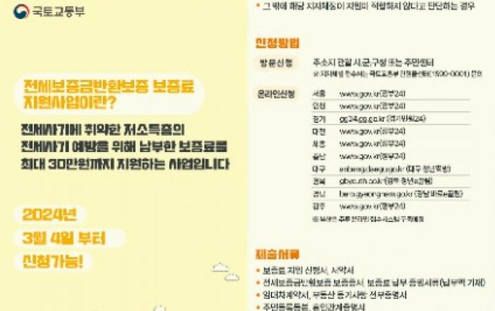 광주광역시(시장 강기정)는 전세사기 피해 방지를 위한 ‘전세보증금반환보증 보증료 지원사업’을 4일부터 전 연령을 대상으로 확대 시행한다고 밝혔다.보증료 지원사업은 전세사기 피해 방지를 위한 전세금보증금반환보증 가입 유도를 목적으로 임차보증금 3억원 이하, 연소득 500