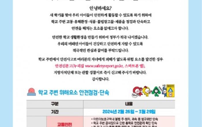 광주광역시(시장 강기정)는 개학(1학기)을 맞아 학교주변 보호구역에 대한 안전점검 및 단속을 추진한다.이번 점검은 어린이가 안전한 학교 환경 조성을 위해 26일부터 3월 29일까지 5주간 관내 155개 초등학교 주변 보호구역을 점검한다.점검대상은 ▲교통안전 ▲유해환경