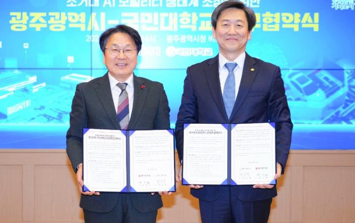 ▲ 강기정 광주광역시장이 16일 오후 시청 비즈니스룸에서 국민대 정승렬 총장과 초거대 AI모빌리티 생태계 조성을 위한 업무협약을 체결하고 있다./광주광역시 제공광주시가 기업과 시민생활에 실질적인 도움이 되는 ‘인공지능 모빌리티 실증도시 모델’을 구축한다.국가인공지능(A