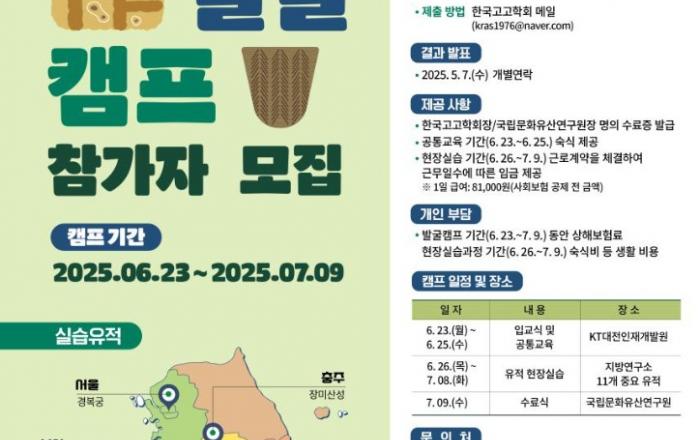 국가유산청 국립문화유산연구원은 한국고고학회(회장 이성주)와 함께 6월 23일부터 7월 9일까지 약 3주간 대학생을 대상으로 한 발굴조사 현장실습 교육과정인 ‘여름 발굴캠프’를 개최하기로 하고, 4월 14일부터 25일까지 참가자 50명을 모집한다.‘여름 발굴캠프’는 국가