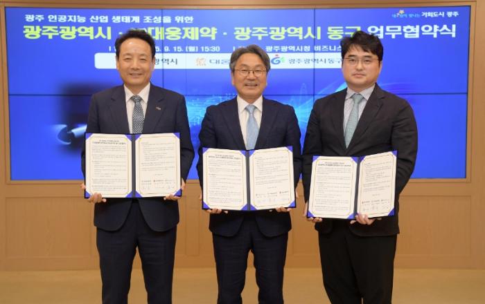 광주광역시(시장 강기정)는 15일 시청 비즈니스룸에서 ㈜대웅제약(대표이사 이창재), 광주 동구(청장 임택)와 함께 ‘광주시 인공지능산업 생태계 조성을 위한 업무협약’을 체결했다.이번 협약은 광주 인공지능(AI) 생태계를 기반으로 디지털 헬스케어 분야의 혁신 성장을 촉진