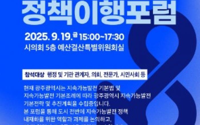 광주광역시(시장 강기정)와 광주연구원, 광주광역시지속가능발전협의회는 오는 19일 오후 3시 광주시의회 5층 예산결산특별위원회실에서 ‘2045 광주 지속가능발전 정책이행포럼’을 개최한다.이번 포럼은 광주시가 ‘지속가능발전기본법’ 및 ‘광주시 지속가능발전 기본조례’에 따라
