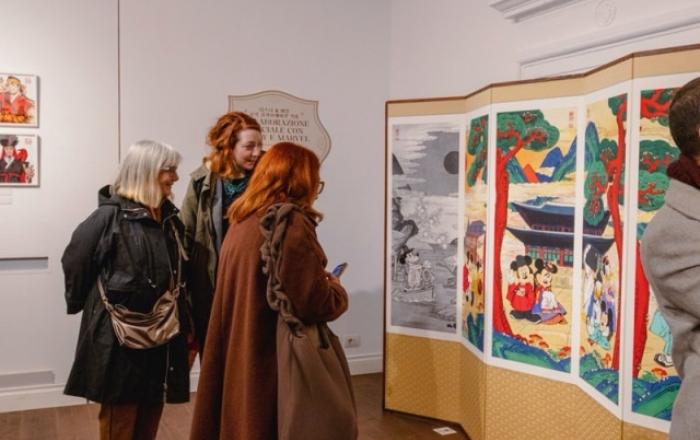 주이탈리아한국문화원이 우나영 작가(활동명 흑요석)의 전시 ‘한복 입은 서양 동화’를 오는 5월 20일까지 주이탈리아한국문화원 전시실에서 선보인다.‘한복 입은 서양 동화’ 전시장 전경(제공=우나영 작가, 주이탈리아한국문화원)신데렐라, 백설공주, 인어공주, 앨리스 등 누구