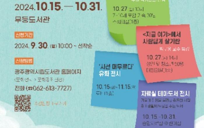 광주광역시시립도서관(무등·사직·산수)은 10월 문화의 달을 맞아 가족들이 함께 즐길 수 있는 강연·전시·체험행사 등 ‘시월 애(愛) 북크닉’ 행사를 운영한다.무등도서관은 오는 15일 유화작품 전시, 자료실 테마도서 전시를 시작으로, 19일 류현주 작가의 ‘반드시 성공