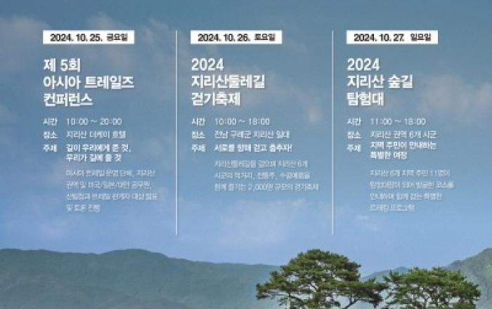 산림청은 오는 10월 25일부터 27일까지 사흘간 전라남도 구례군 지리산 일대에서 ‘제5회 아시아 트레일즈 컨퍼런스’를 개최한다고 7일 밝혔다.지난 2014년 한국, 일본, 중국, 대만, 러시아, 몽골, 부탄 등 아시아 7개국이 함께 모여 ‘아시아 트레일즈 네트워크’를
