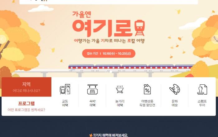 문화, 가을, 미식 등 11개 주제의 70여 개 지역여행 프로그램을 30% 할인하고 최대 50% 할인한 ‘웰촌 농촌여행상품’도 선보인다.또한 24개 소도시로 떠나는 당일 기차여행 ‘가을엔 여기로’를 8차례 운영해 1인당 4만 9000원으로 교통부터 식사, 관광지 입장까