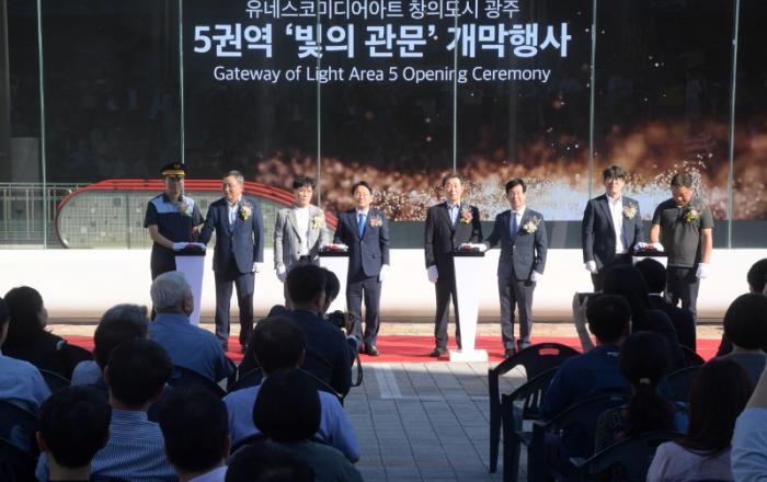 유네스코 미디어아트 창의벨트 5권역 사업인 광주송정역 ‘빛의 관문’이 공식 운영에 들어갔다. 광주광역시(시장 강기정)는 30일 광주송정역 광장에서 강기정 시장과 박병규 광산구청장, 한국철도공사 등 관계기관, 콘텐츠 제작에 참여한 ㈜이지위드, 미디어아트 작가 등이 참석한