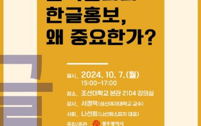 광주광역시(시장 강기정)는 제578돌 한글날을 맞아 오는 7일 오후 3시 조선대학교 본관 2104호에서 ‘2024 한글날 명사 초청 강연’을 개최한다.이날 강연은 서경덕 성신여자대학교 교수가 ‘한국문화와 한글 홍보, 왜 중요한가?’를 주제로 대한민국의 문화적 자산인 한