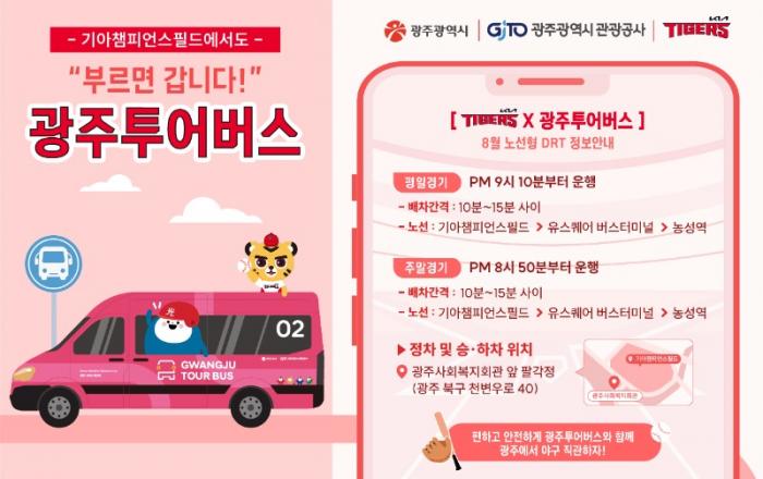 광주시가 ‘부르면 찾아가는’ 수요응답형(DRT) ‘광주투어버스’의 운행 정류장에 기아챔피언스필드를 추가한다. 광주시는 기아챔피언스필드 정류장뿐만 아니라 앞으로 김치축제장, 서창억새축제장, 김대중컨벤션센터를 새로운 정류장으로 확대, 관광객의 이용편의를 높일 방침이다.광주