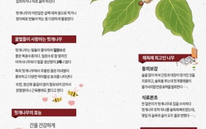 간 건강과 피로 해소에 탁월!…8월 임산물 ‘헛개나무’산림청(청장 임상섭)은 8월 이달의 임산물로 간 해독에 탁월한 효능을 지닌 ‘헛개나무’를 선정했다고 9일 밝혔다.헛개나무는 ‘암펠롭신(Ampelopsin)’과 ‘호베니틴스(Hovenitins)’라는 생리활성 물질을