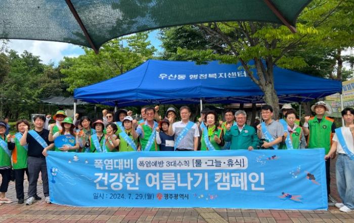 광주광역시(시장 강기정)는 29일 자율방재단연합회, 북구청 등과 함께 말바우시장과 우산근린공원에서 ‘폭염 대비 건강한 여름나기 캠페인’을 펼쳤다. 캠페인은 연일 폭염으로 온열환자가 증가함에 따라 사전에 온열질환을 예방하고 폭염으로 인한 시민의 불편을 최소화하기 위해 진