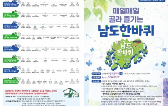 전라남도 관광지 순환버스 ‘남도한바퀴’가 새 단장을 마치고 여름 코스 운행을 본격 시작했다.남도한바퀴는 외지 관광객도 쉽게 이용할 수 있게 광주 유스퀘어(광주종합버스터미널)와 KTX 광주송정역에서 출발한다. 각 관광지마다 문화관광 해설사의 재미있는 설명을 통해 관광객