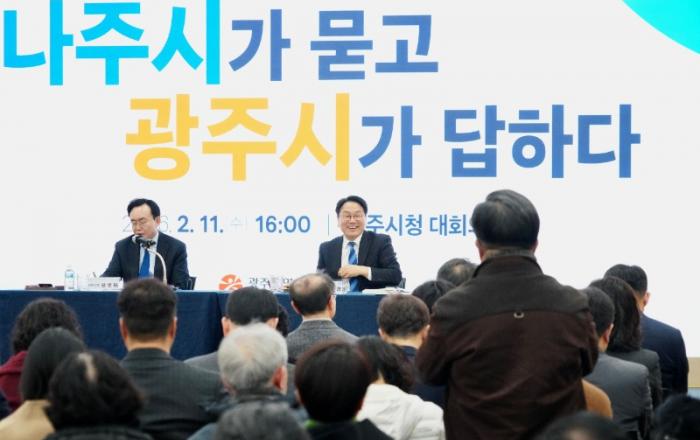 광주광역시(시장 강기정)는 11일 오후 나주시청 대회의실에서 ‘광주전남 통합 나주시 상생토크’를 개최하고, 통합의 필요성과 나주시 발전 방안에 대해 나주시민과 소통했다.이날 상생토크에는 강기정 광주시장과 윤병태 나주시장 등 200여명이 참석해 통합 이후 나주시의 역할과
