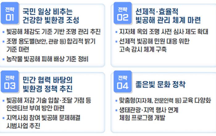 정부가 빛공해 사전 예방 체계 강화를 위해 현재 일부 지자체에서만 시행하고 있는 옥외조명 사전 심사제도를 전국으로 확대한다. 이에 옥외조명 사전 심사제도 대상 및 심사 항목 등에 대한 가이드라인를 마련하는 등 지자체의 제도 활성화를 지원할 계획이다. 환경부는