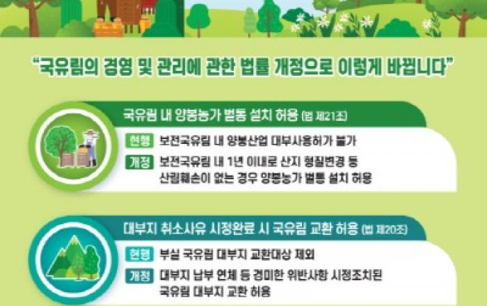 산림청은「국유림의 경영 및 관리에 관한 법률」 일부개정안이 국회 본회의를 통과했다고 11일 밝혔다. 개정안의 주요내용은 보전국유림 내 양봉농가 벌통 설치 허용, 대부지 취소사유 시정 완료 시 국유림 교환 허용, 국유림 대부료 또는 사용료