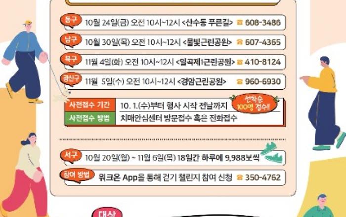광주광역시(시장 강기정)는 치매 인식 개선을 위해 자치구별로 ‘2025 한마음 치매극복 걷기행사’를 개최한다.이 행사는 광주시와 전남대학교병원, 광주광역치매센터가 공동주최하고 5개 자치구 보건소 치매안심센터가 주관한다. 프로그램은 ▲치매예방체조 ▲바르게 걷기 방법 안내