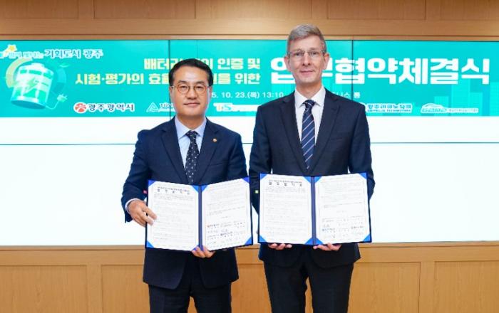 광주시가 지역 배터리 산업의 해외 진출 지원을 위해 4개 지역 연구기관 및 글로벌 시험·인증 전문기관과 손잡고 해외인증 시험기관 지정에 나섰다.광주광역시(시장 강기정)는 23일 오후 1시10분 시청 비즈니스룸에서 한국전기연구원, 한국교통안전공단 친환경자동차인증센터, 광
