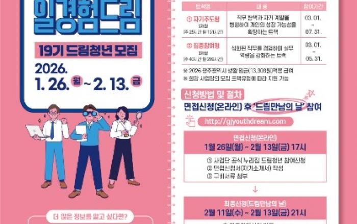 광주시, 청년 커리어 첫걸음 ′드림청년′ 모집광주광역시(시장 강기정)는 올해 상반기 ‘광주청년 일경험드림’에 참여할 제19기 드림청년 450명을 1월26일부터 2월13일까지 모집한다.‘광주청년 일경험드림’은 청년들이 다양한 직무를 직접 경험하며 진로를 탐색하고 실무 역